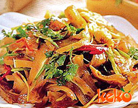 3.将压平的猪耳朵平面放案上,片成20 片或更多的薄片,再切成0.05厘米的细丝;