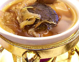 佛跳墙:'1.鱼翅先用大火煮1/2小时后取出,放进冷水里冲洗,隔天再捞起,续煮1/2小时,而后再冲洗,连续6天的煮和洗,最后再剥掉表层的糙面。2.鲍鱼用小火煮5天...